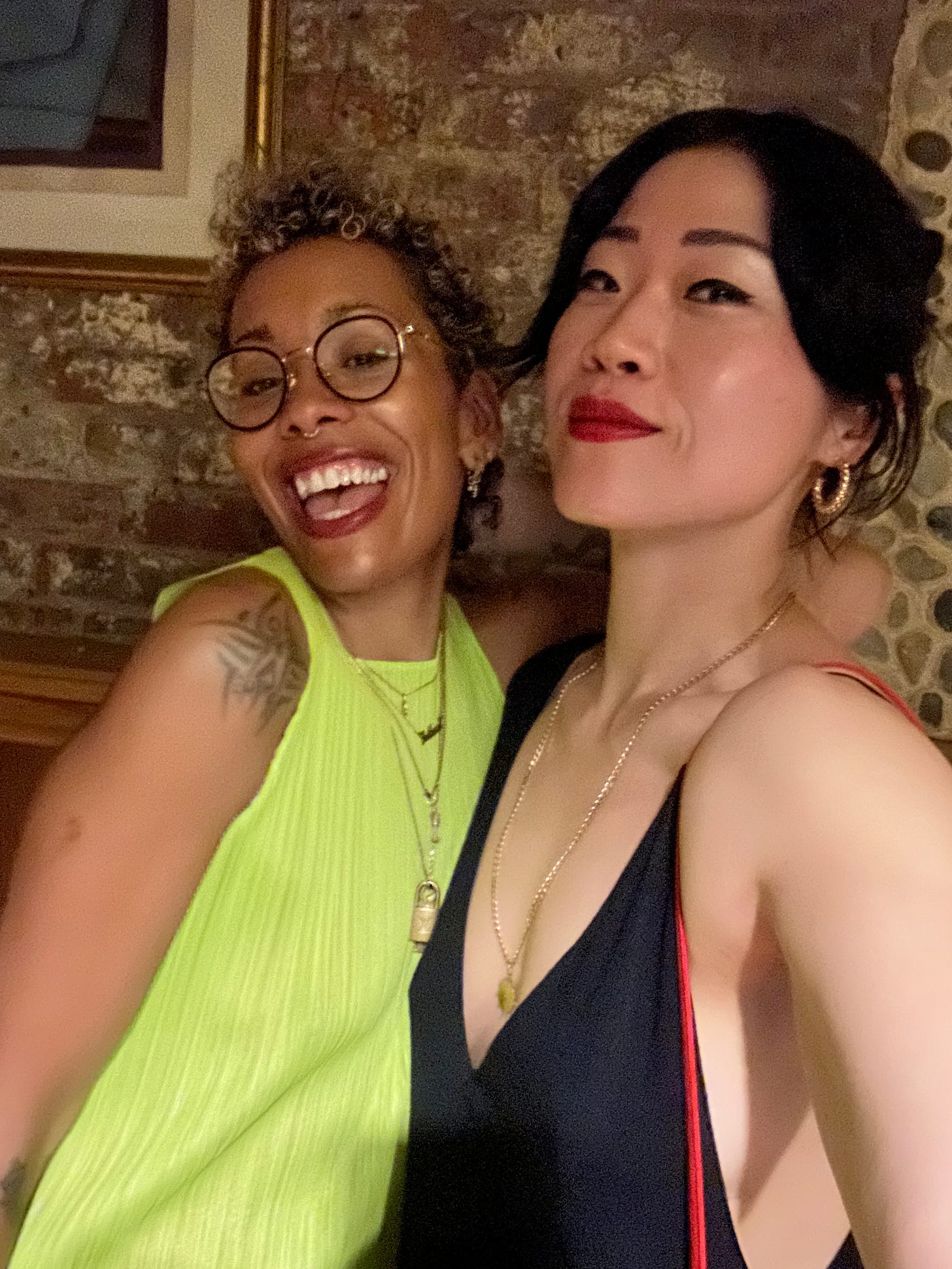 Oooh, that said, the thing we did? The wet thing? The substack event a week ago at a bathhouse with many luminaries? It was super fun. It defied expectations. Even my partner had fun and sometimes we are in a contest to stubbornly begrudge all fun as an exercise in self-preservation because we like to be in our apartment so much. But we were wrong. We had fun. Here is a photo of me and my friend. We were told to wear bathing suits but we are disruptors and the bathhouse is not our mother. The photo is also blurry. Forgive me.